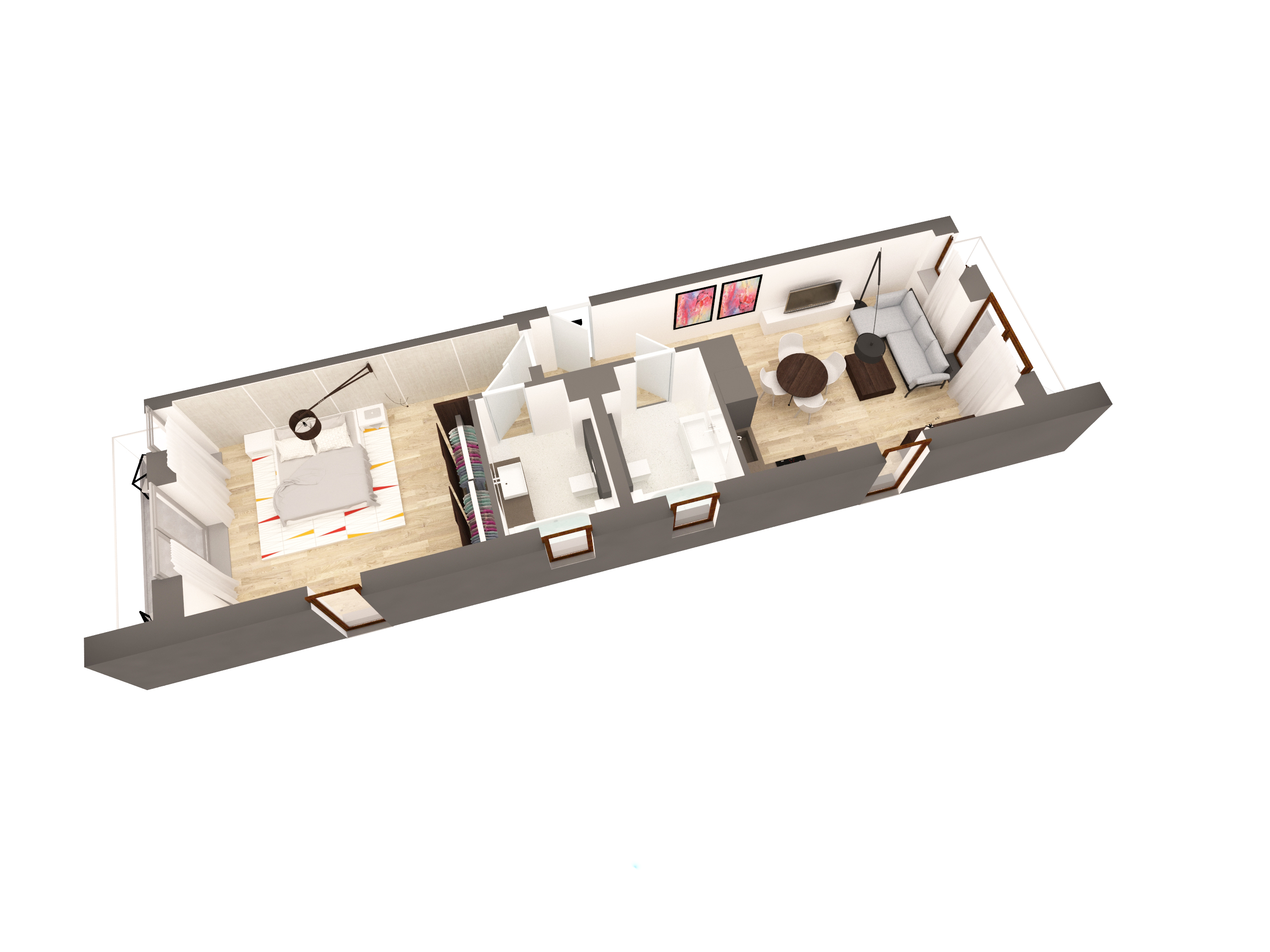 Apartament ma rozkład umożliwiający jego podział na dwa oddzielne mieszkania, co będzie korzystne dla inwestora pod kątem późniejszego wynajmu lokalu.