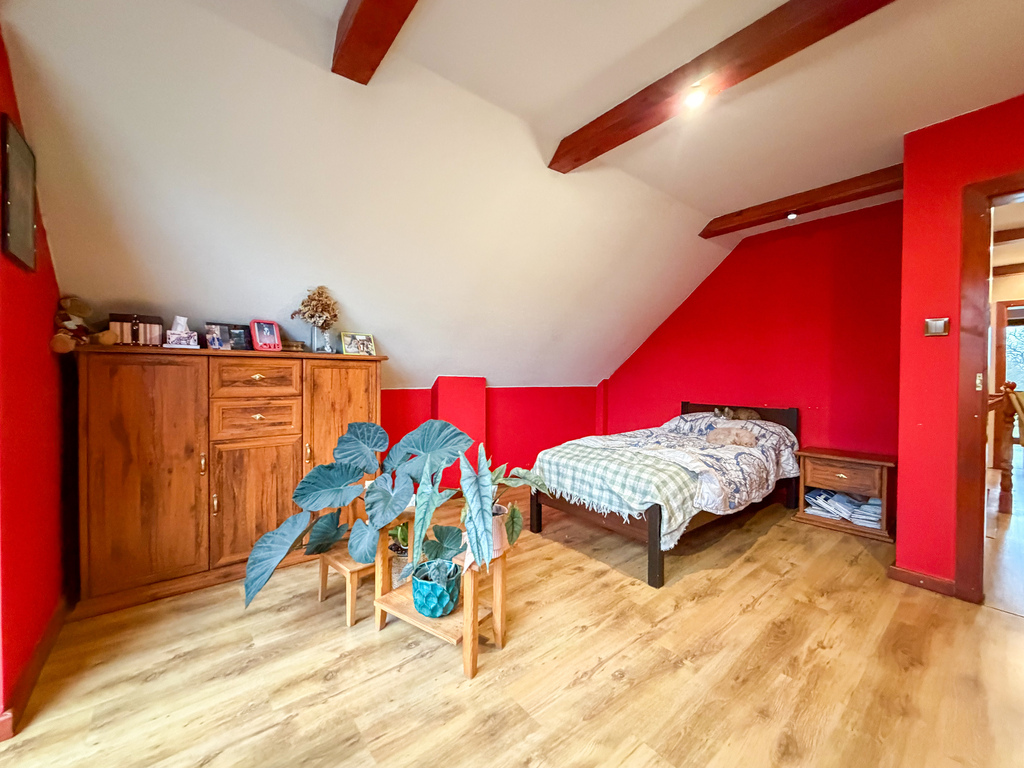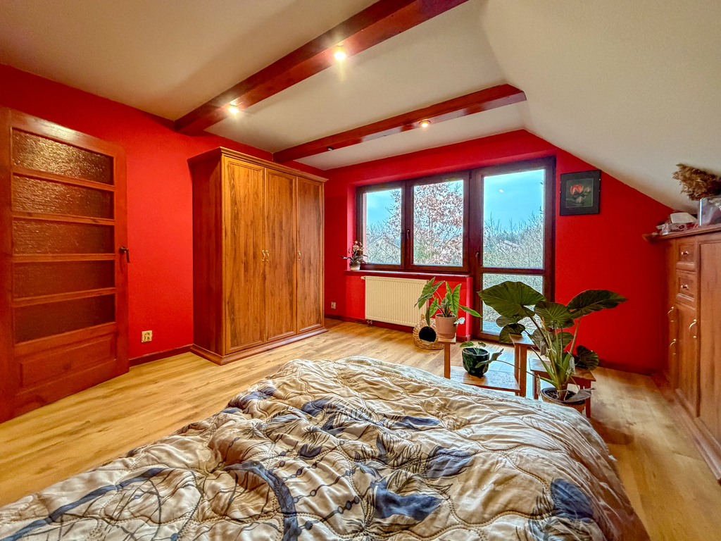 Dom posiada funkcjonalny układ i duży zapas przestrzeni, który daje możliwość wydzielenia dodatkowych pokoi lub stworzenia nowej, bardziej otwartej strefy dziennej.