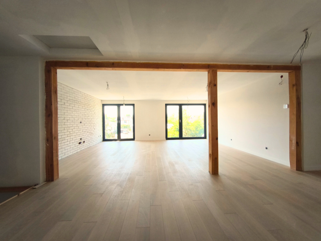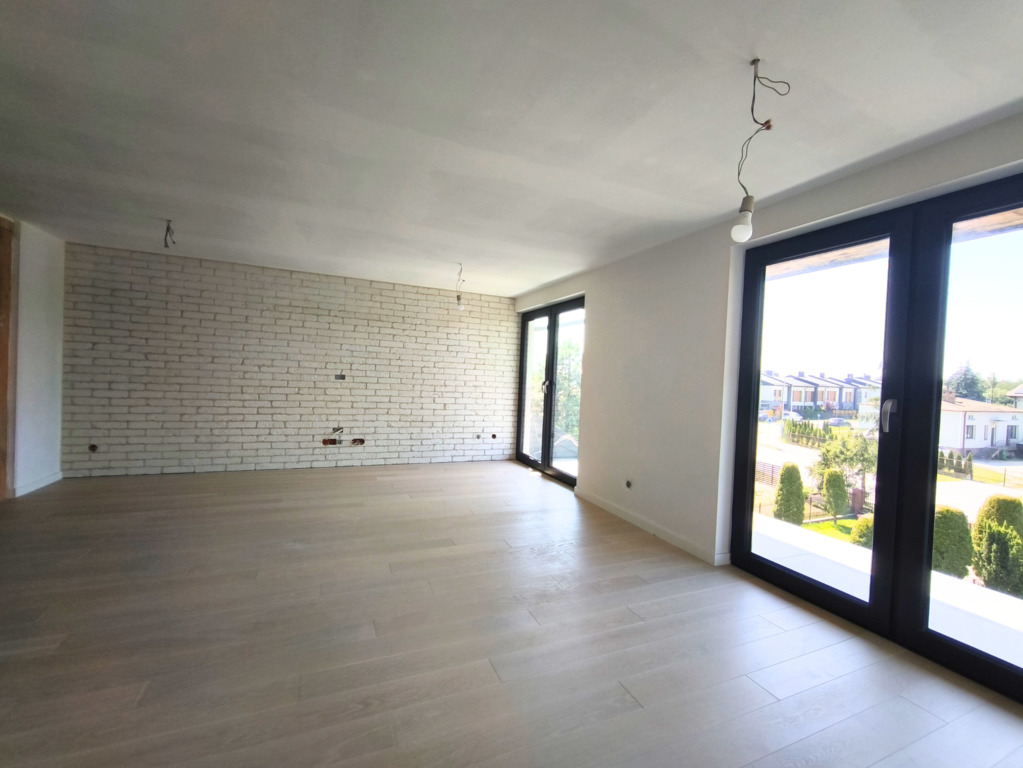 Duży, jasny salon z wyjściem na taras i ogród, garderoba, łazienka oraz przestronny przedpokój.