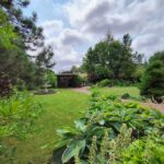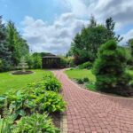 Na podwórku liczne nasadzenia: drzewa, krzewy i kwiaty wieloletnie.