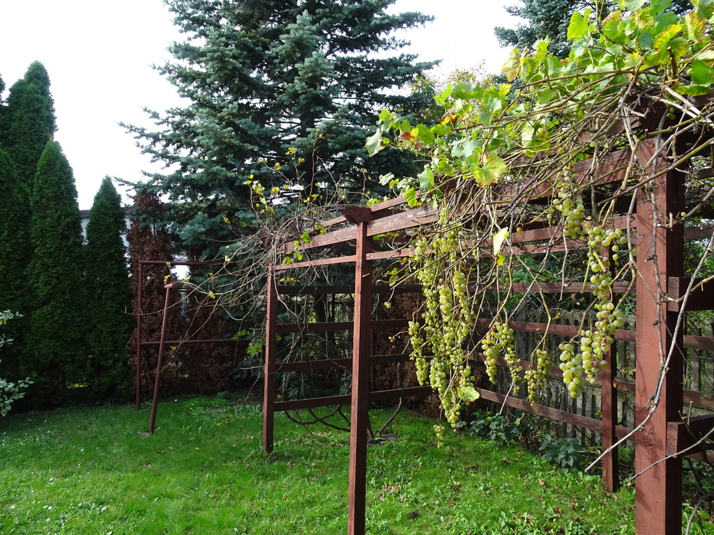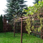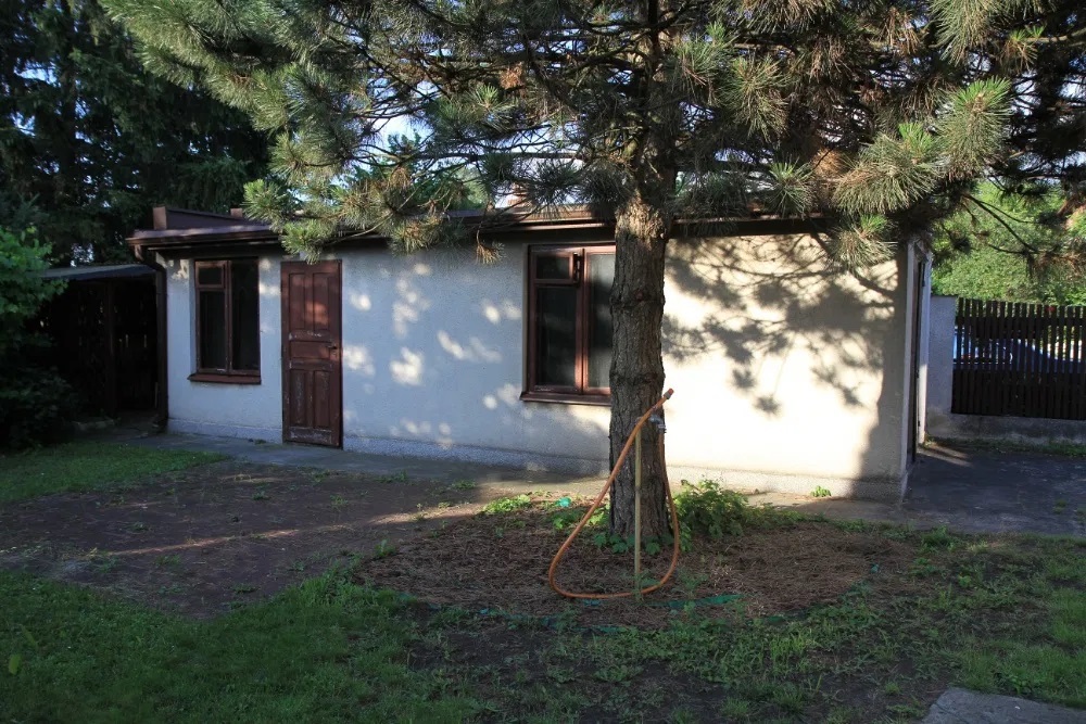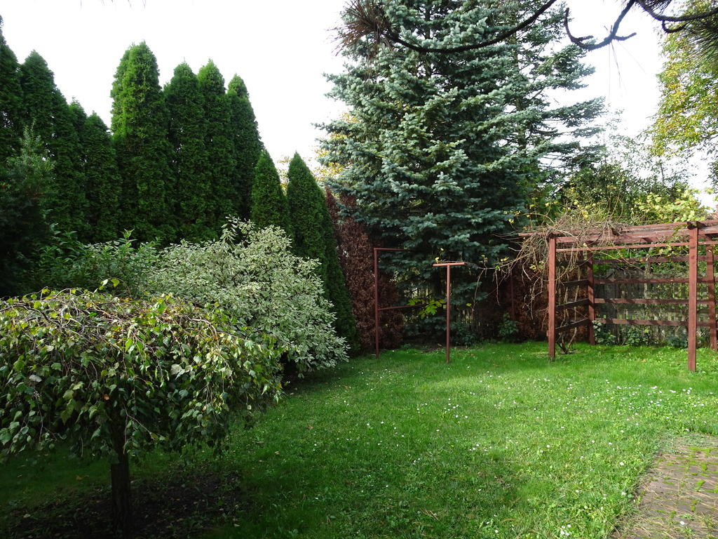 Na działce znajduje się garaż z kanałem, niewielka wiata, drzewa, pergola oraz rośliny ozdobne.