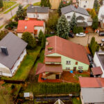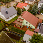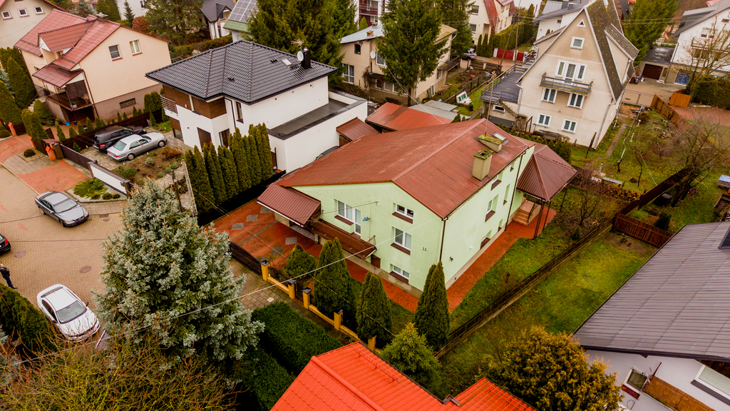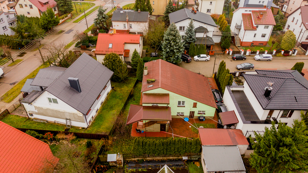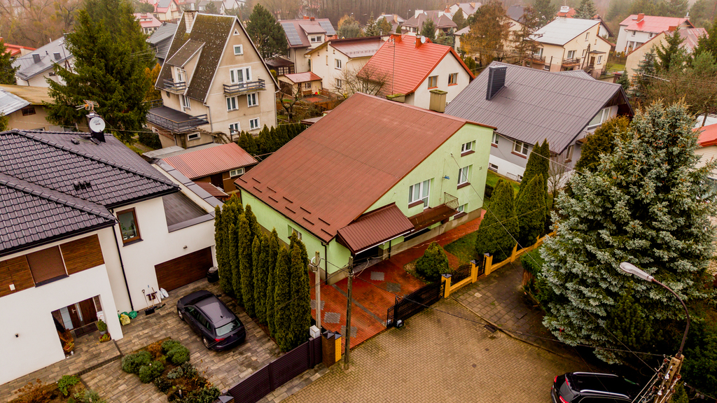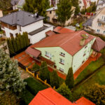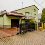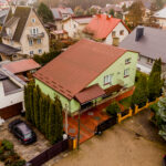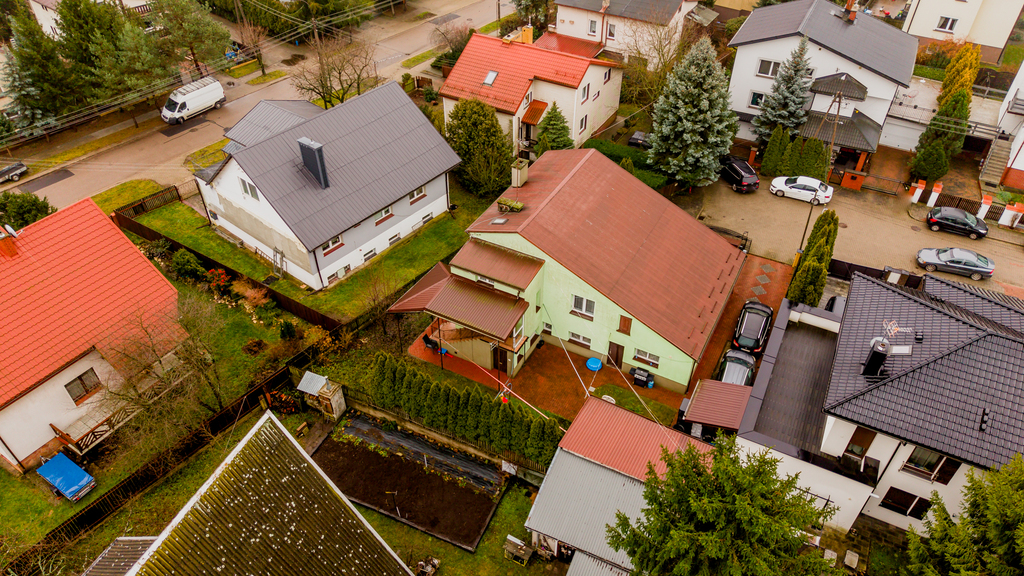 - Wygląd zewnętrzny: dom w stylu lat 80./90., z elewacją w pastelowej zieleni i dachem pokrytym blachą trapezową w kolorze rdzawym.
