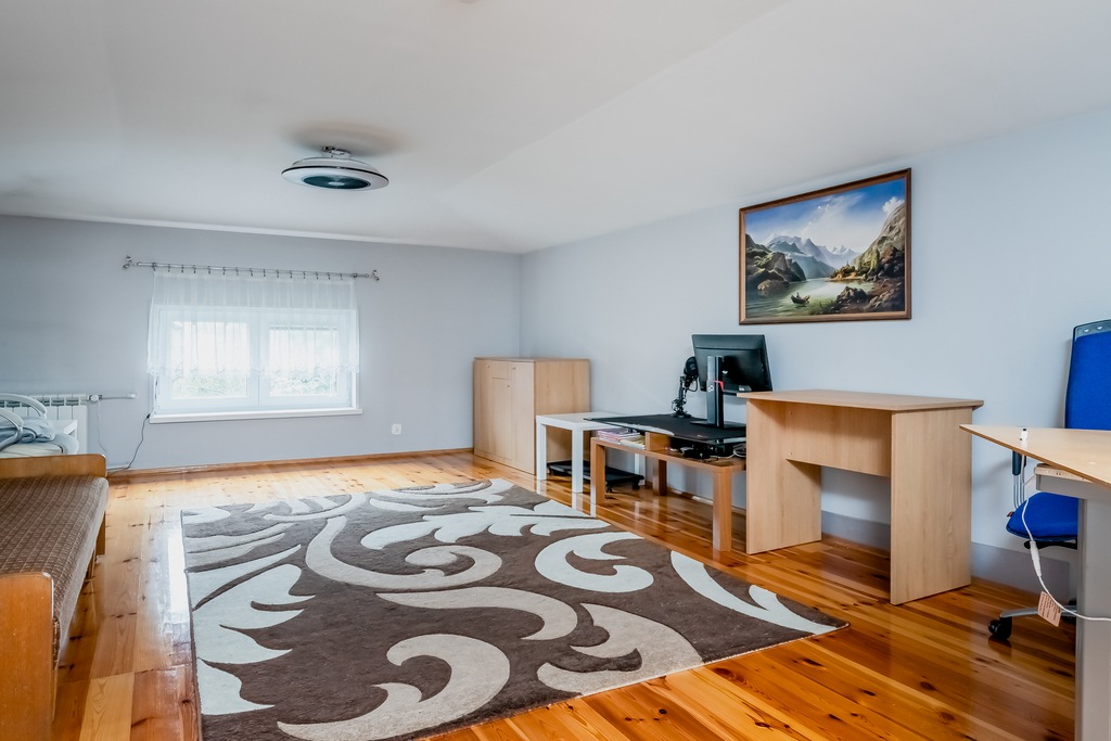 - Pomieszczenia mieszkalne/robocze: gabinet 20,1 m2 sypialnia 9,5 m2 kuchnia 7,6 m2 łazienka 4,3 m2