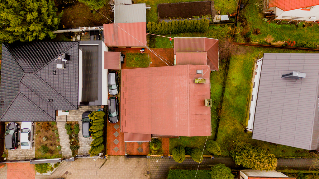 - Parkowanie i zaplecze: posesja ogrodzona, z dużym podjazdem z kostki brukowej. W bryle domu znajduje się garaż 41 m2 a na działce zlokalizowany jest dodatkowy budynek gospodarczy.