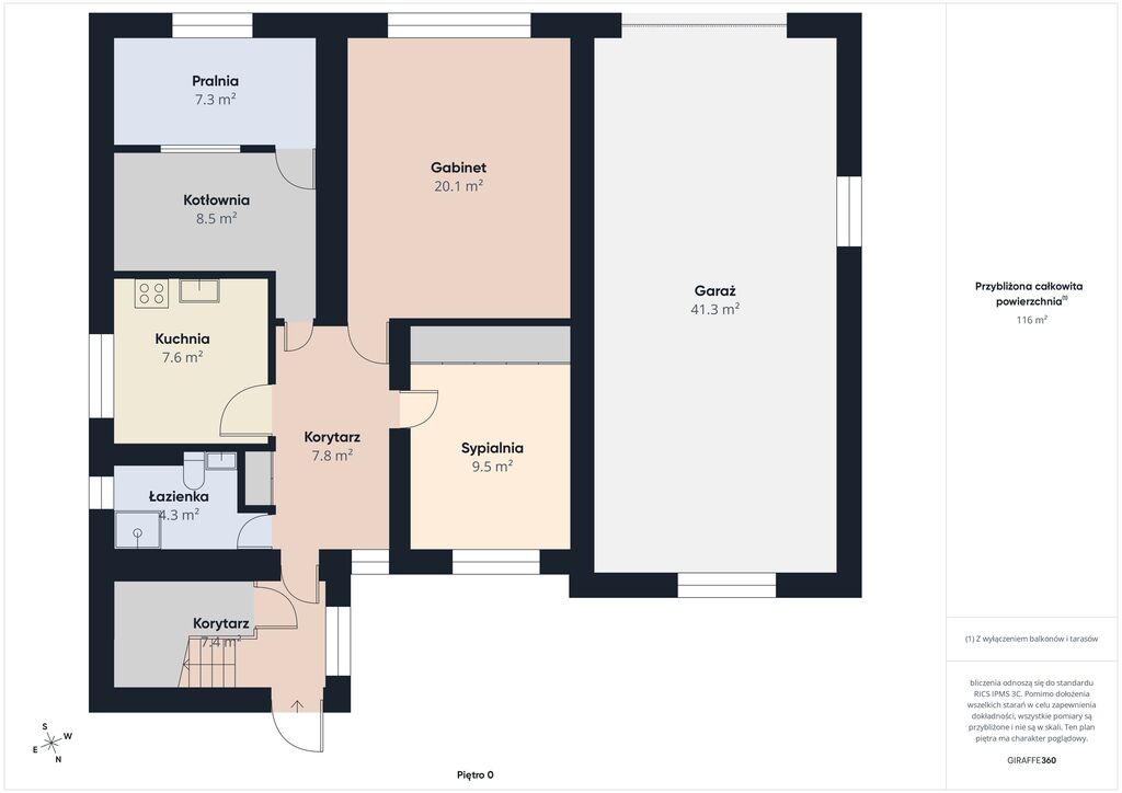 - Zaplecze: garaż 41,3 m2, kotłownia m2, pralnia $7,3 m2.