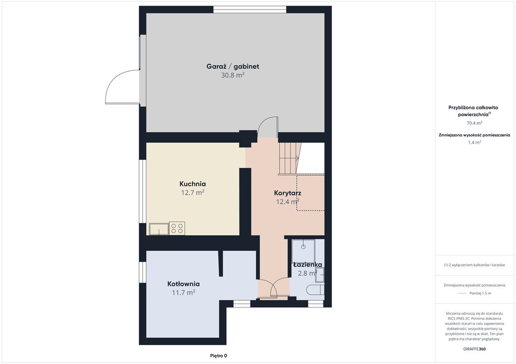 Podpiwniczenie - powierzchnia biurowa / garaż, kuchnia, łazienka, kotłownia, korytarz.