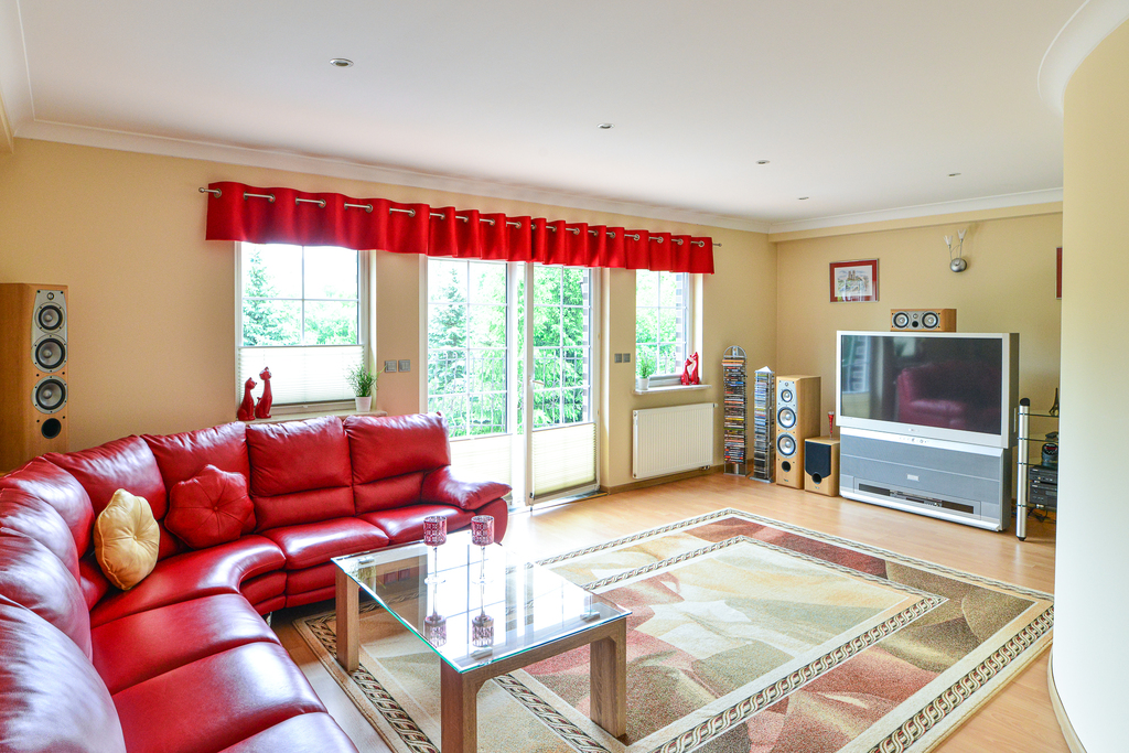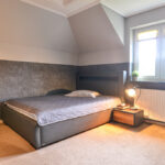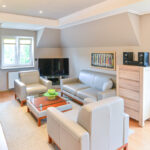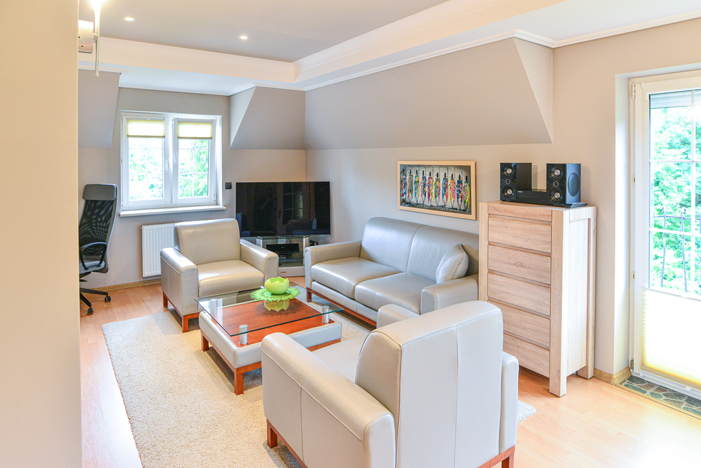 Ponadto na tym piętrze znajdziemy bardzo dużą jasną garderobę i pokój telewizyjny.