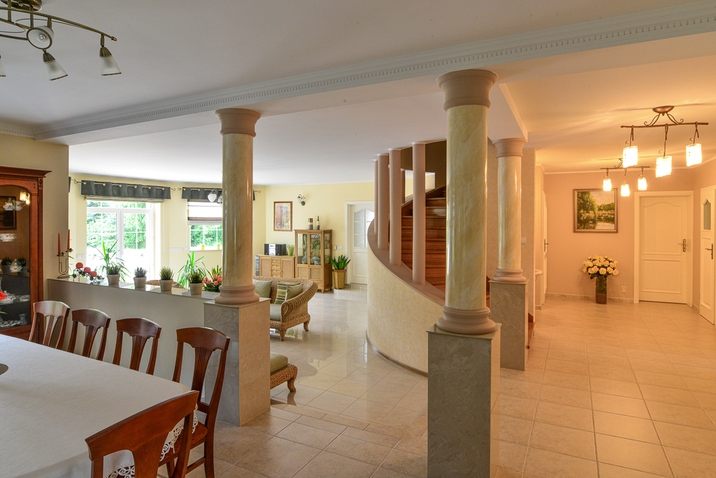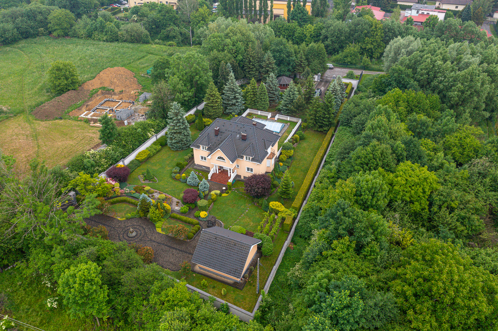 Dom 485m2 w tym na parterze salon, jadalnia, kuchnia, gabinet, pokój z kominkiem. Na górze 4 bardzo duże pokoje, garderoba, dwie łazienki.