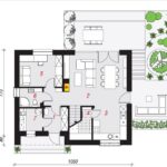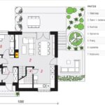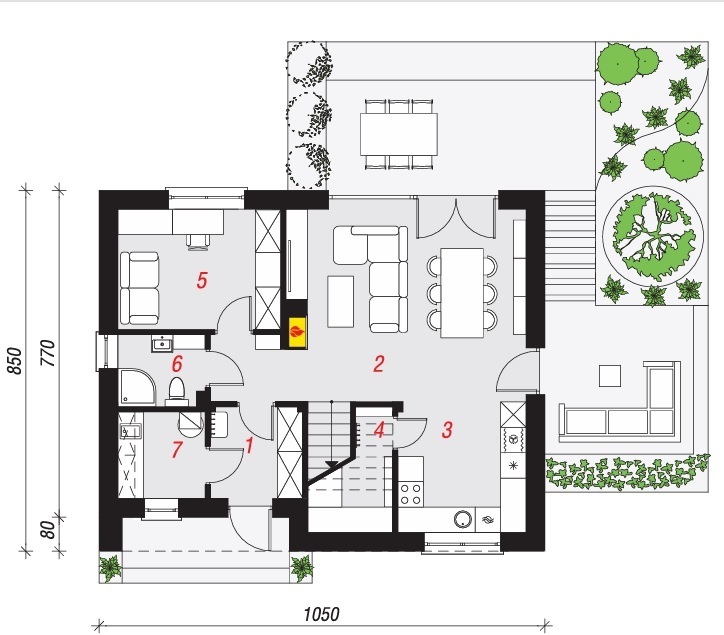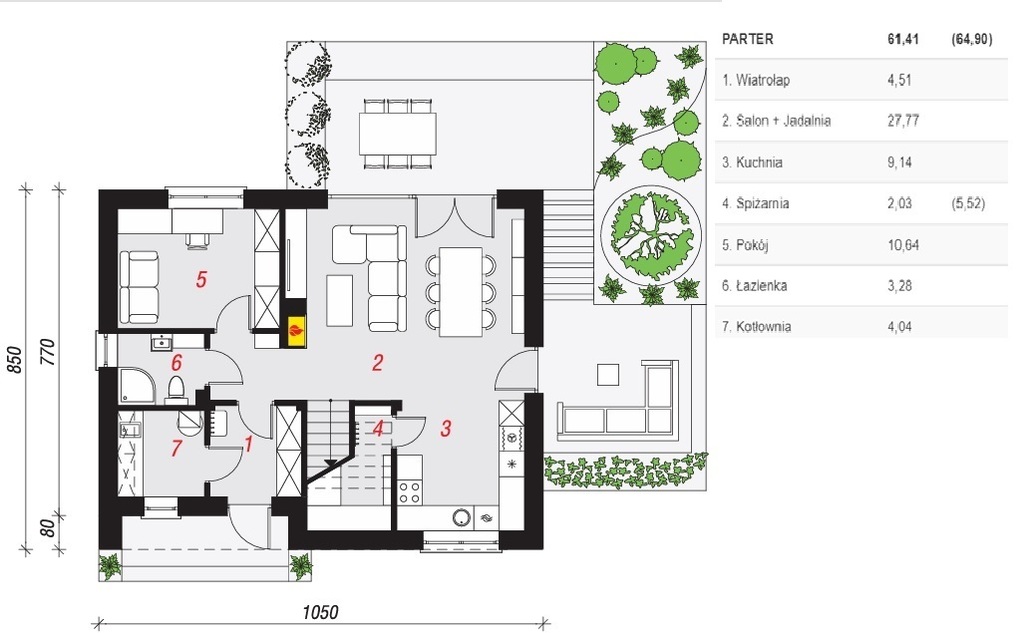 Parter: Salon z jadalnią, kuchnia, spiżarka, pokój, łazienka, wiatrołap, kotłownia