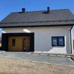Okna 3-szybowe w kolorze antracyt. Dom ocieplony styropianem o grubości 20 cm, wykonana elewacja w kolorze kremowo-szarym.