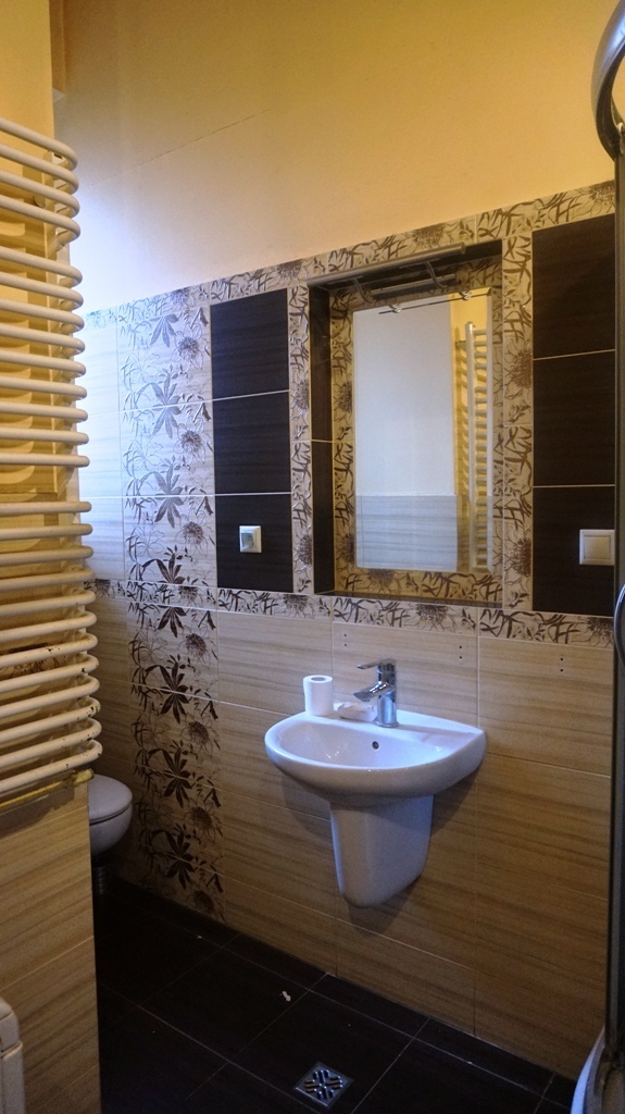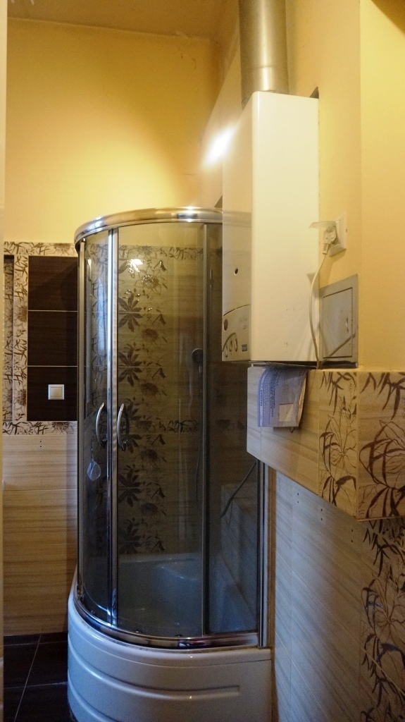 W łazience: prysznic, wc, umywalka , na ścianach i posadzce ceramika, okna w mieszkaniu drewniane około 20-letnie. Mieszkanie ogrzewane piecem gazowym dwufunkcyjnym. Do mieszkania przynależy duży balkon.