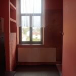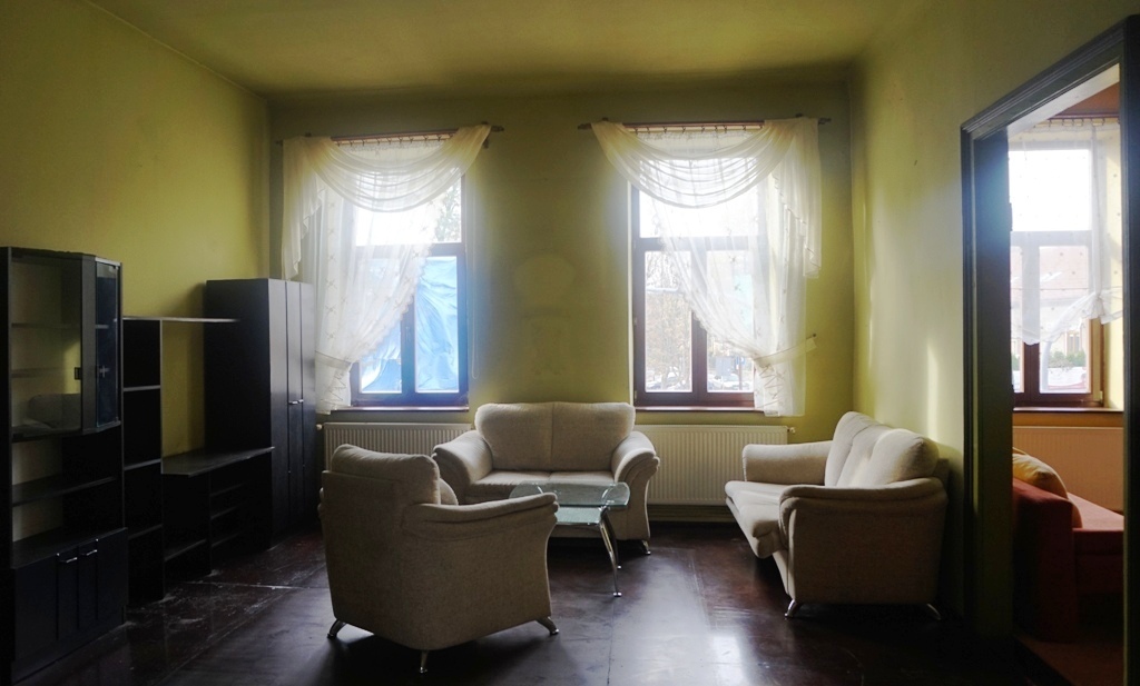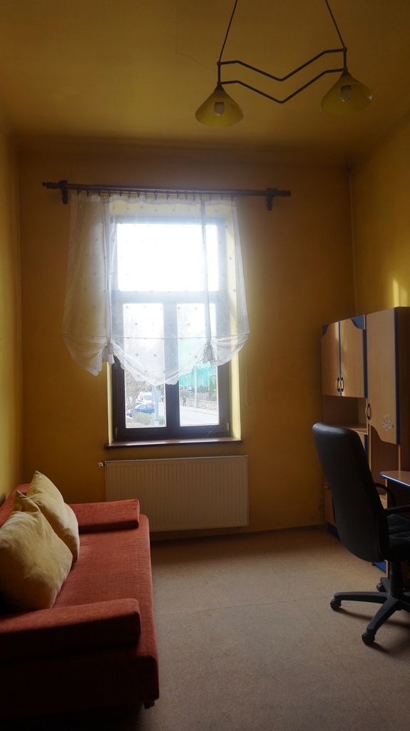 68,28 mkw położony na I piętrze: składający się z kuchni, łazienki, trzech pokoi. Na podłogach w pokojach deski drewniane przykryte płytami paździerzowymi , w kuchni terakota.