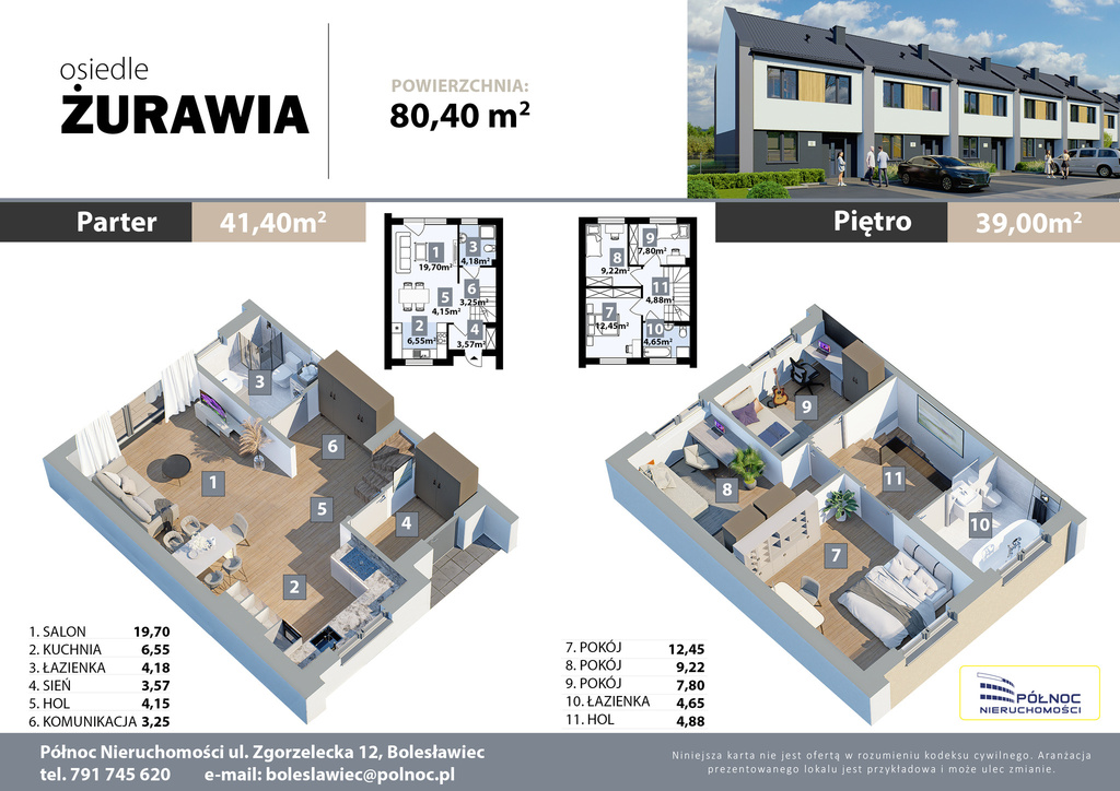 PÓŁNOC NIERUCHOMOŚCI O/Bolesławiec prezentuje nowe domy jednorodzinne w zabudowie szeregowej o powierzchni 80,4 m² (plus strych), zaprojektowane z myślą o komforcie życia rodziny, niskich kosztach utrzymania oraz pełnym poczuciu prywatności. Inwestycja realizowana jest przy ul. Żurawiej w Bolesławcu – Osiedle Kwiatowe i obejmuje kameralne osiedle 13 domów z ogrodami, tarasami
