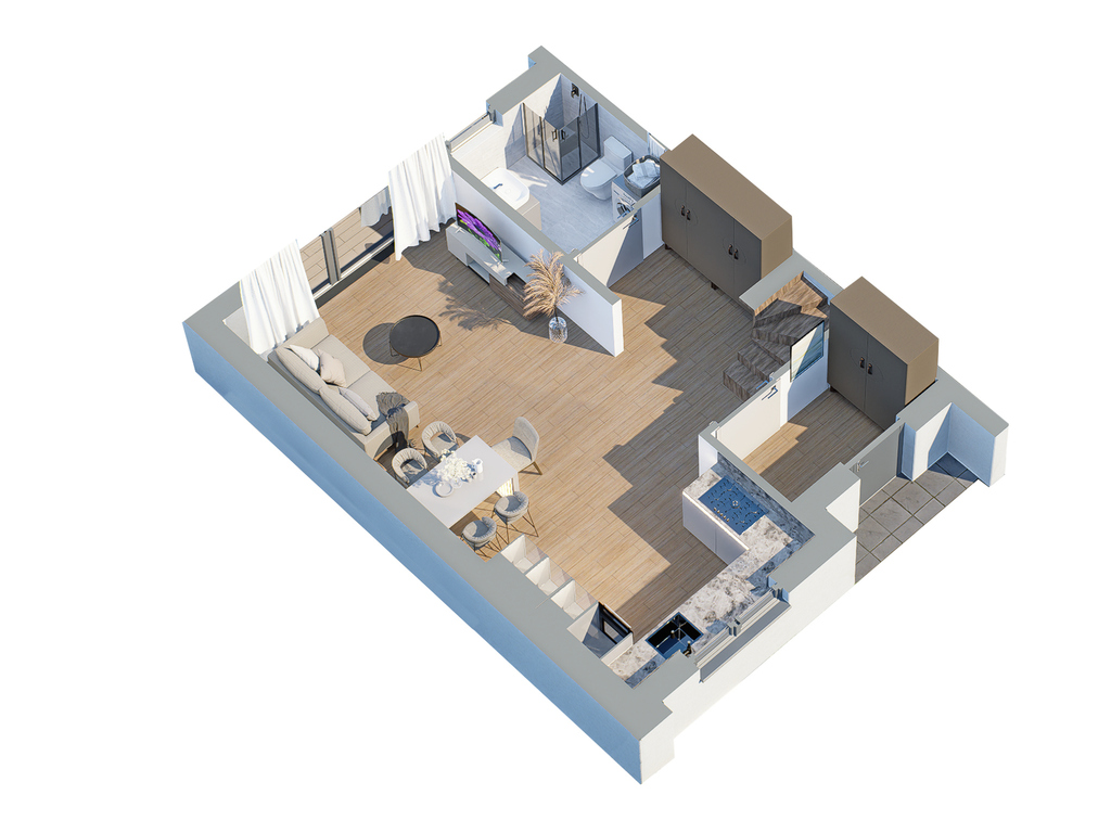 Przedstawione wizualizacje i grafiki mają charakter wyłącznie poglądowy i stanowią wyłącznie materiał pomocniczy, ułatwiający zorientowanie się w ogólnym wyglądzie oferowanej nieruchomości.