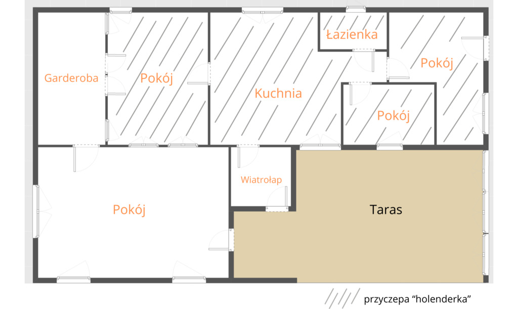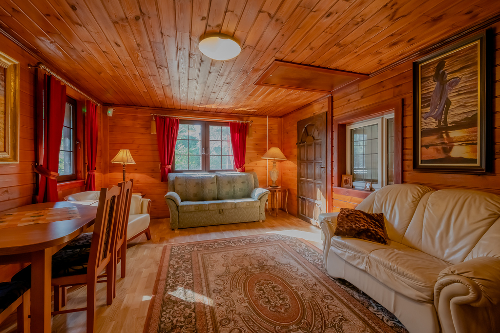 Budynek drewniany na  bazie  przyczepy holenderskiej  o pow. użytkowej 70 m2 + zadaszony taras ok 30 m2, co daję imponującą powierzchnie  całkowitą ok. 100 m2 !
