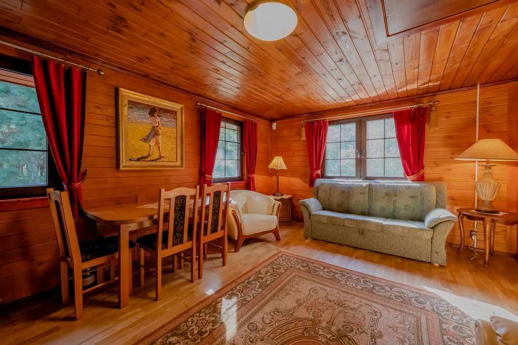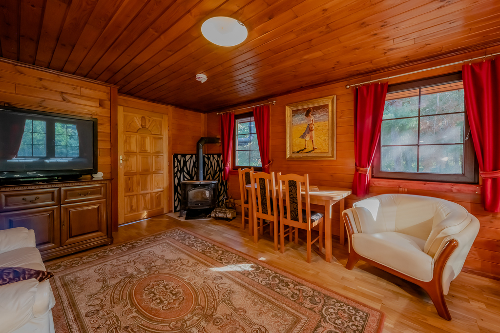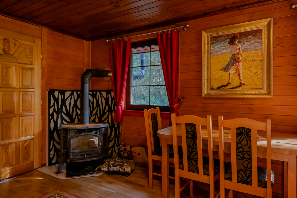 Ogrzewanie: kominek -  w salonie, natomiast  w pozostałych pomieszczeniach  funkcjonuje centralne  ogrzewanie zasilane  piecem indukcyjnym  na gaz butli użytkowych. Możliwość korzystania z domku w okresie zimowym.