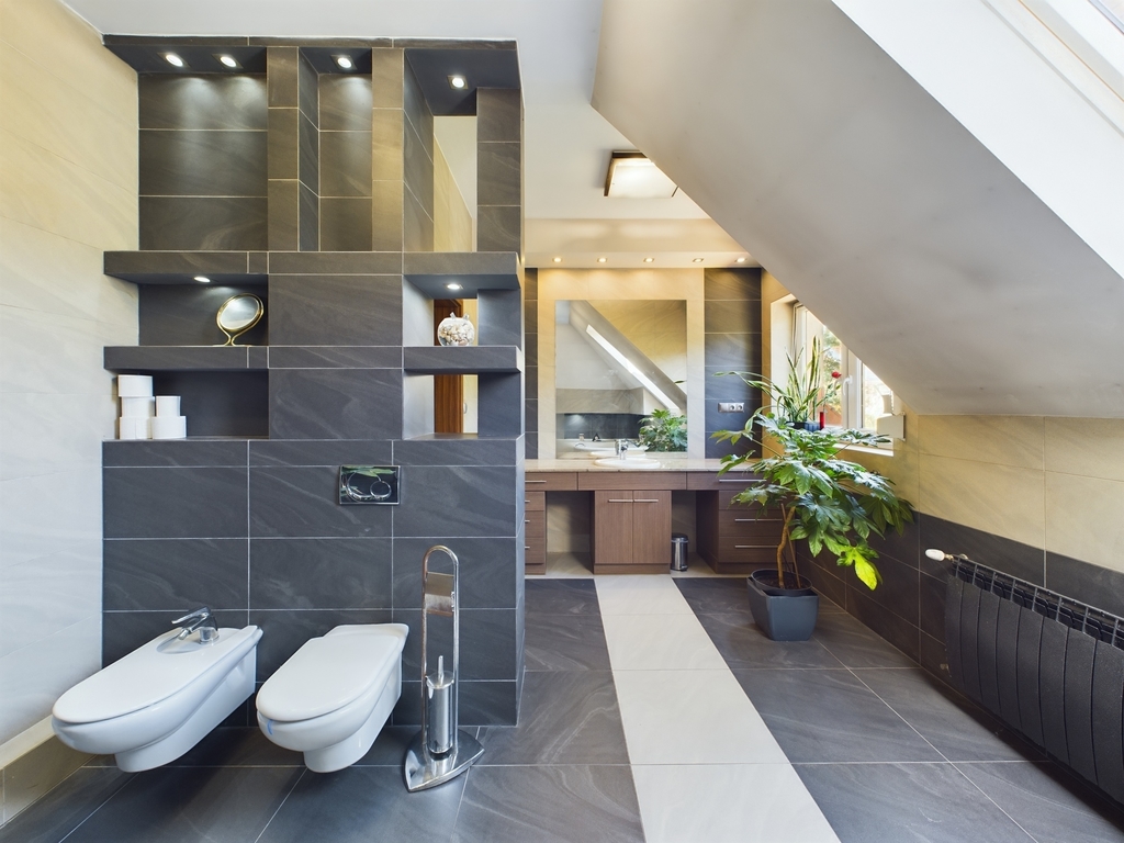 - Parter: reprezentacyjny hall, przestronny salon z kominkiem z płaszczem wodnym, jadalnia, osobna kuchnia z granitowymi blatami, pokój, łazienka z prysznicem