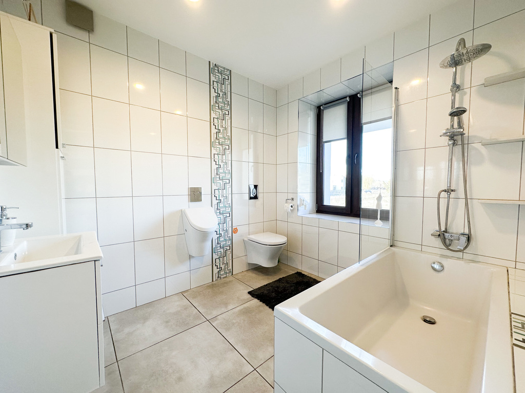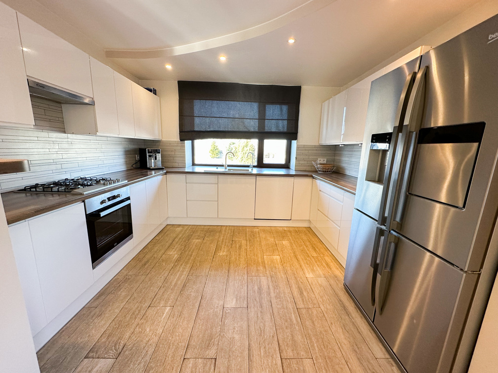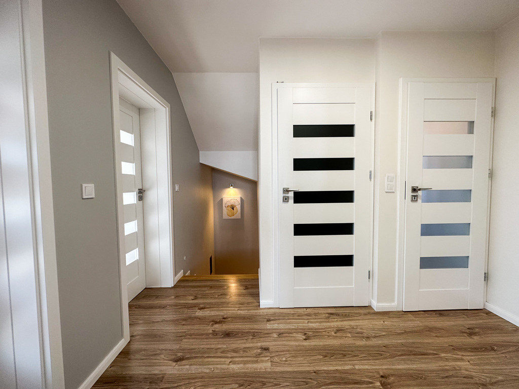 WYSOKA JAKOŚĆ WYKOŃCZENIA - ogrzewanie podłogowe w całym domu, nowe okna PCV z okuciami i szybami antywłamaniowymi, drzwi przeciwwłamaniowe, w budynku jest mnóstwo gniazdek ethernetowych, po 2-3 na każdej kondygnacji, wysokiej jakości meble kuchenne robione na zamówienie, podwieszane sufity w całym domu, brama wjazdowa i garażowa na pilota (zsynchronizowane w jednym pilocie), dwa wideofony (parter i piętro) z możliwością otwierania bramy i furtki