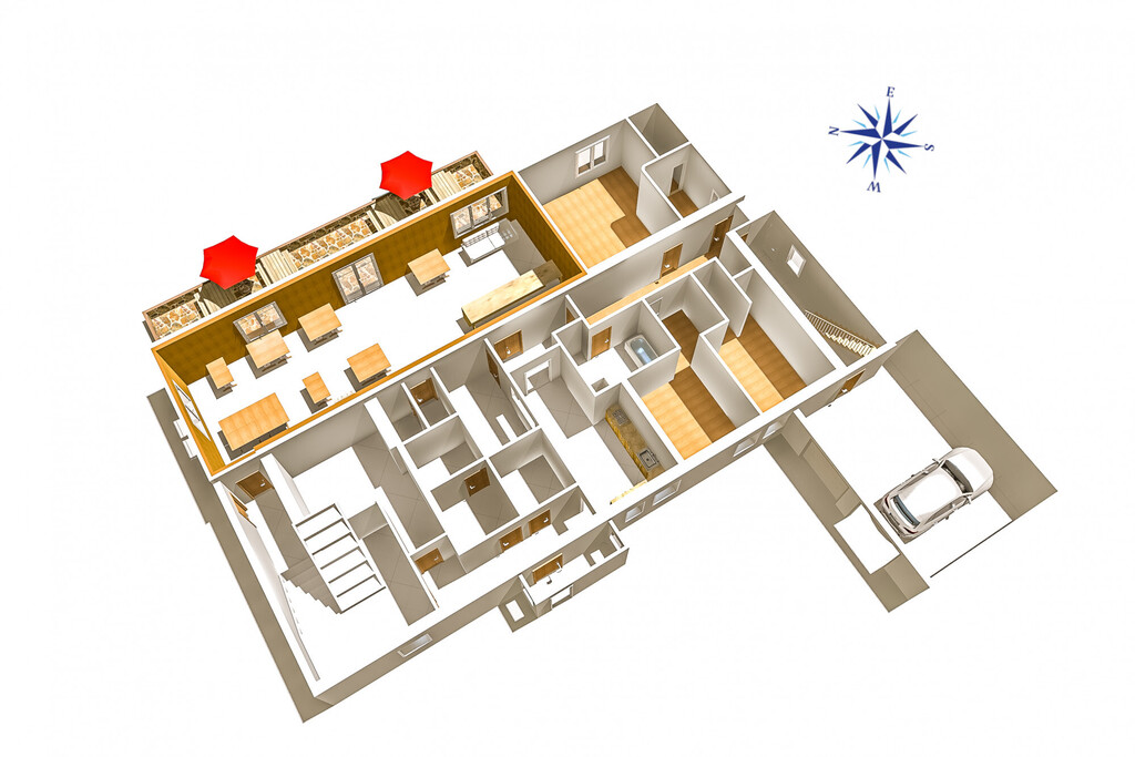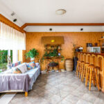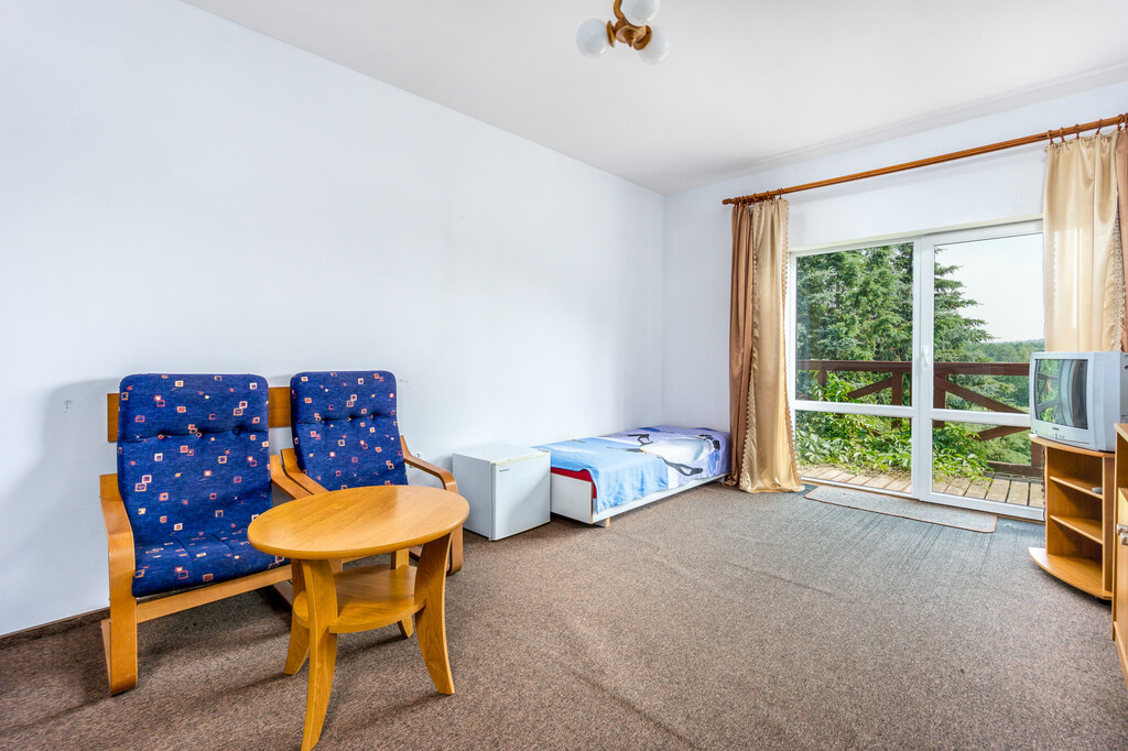 - pensjonat (10 pokoi gościnnych, sala jadalna z kominkiem i barkiem, zaplecze kuchenne, taras)