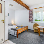 Dostępnych jest 31 miejsc noclegowych w pokojach. W każdym pokoju TV, w apartamentach lodówka.