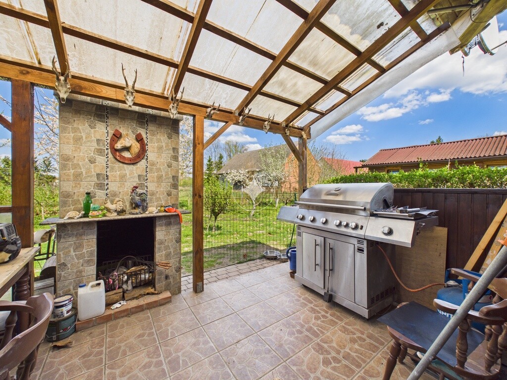 Z tyłu domy znajduje się zabudowany taras (letnia kuchnia) z wyjściem na ogród i zewnętrzną część tarasu.