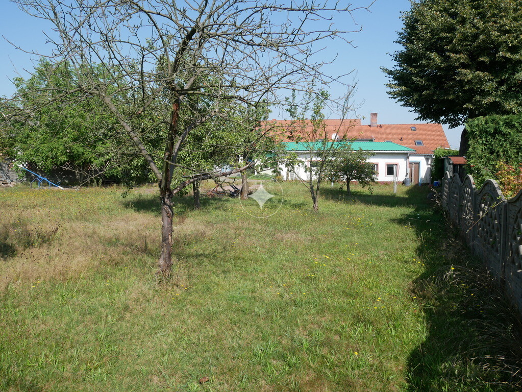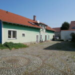 Przy domu teren wyłożony kostką. Za zabudowaniami gospodarczymi sad.