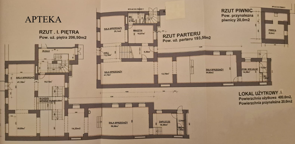 Kamienica o łącznej powierzchni 1275m2 w skład której wchodzą 5 lokali mieszkalnych, 7 usługowych oraz 4 garaży wraz z powierzchniami przynależnymi:I - lokal usługowy o powierzchni 420m2 (Apteka i Biuro)
