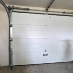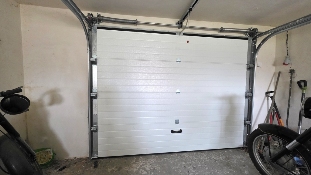 Garaż w bryle budynku z kanałem i automatyczną bramą.