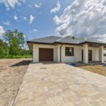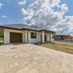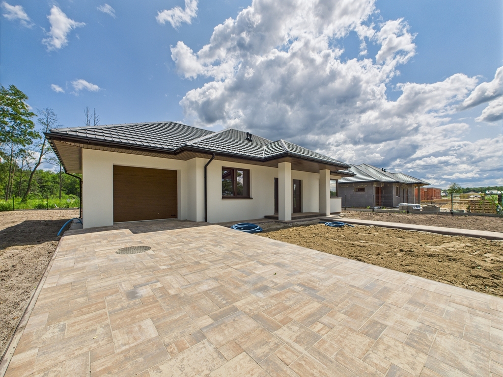 - Podjazd: Wykonany z kostki brukowej z opaską wokół domu i tarasem