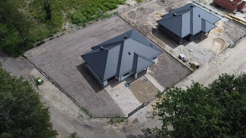 - Dach i cokół: Blachodachówka w kolorze brązowym, cokół w kolorze brązowym