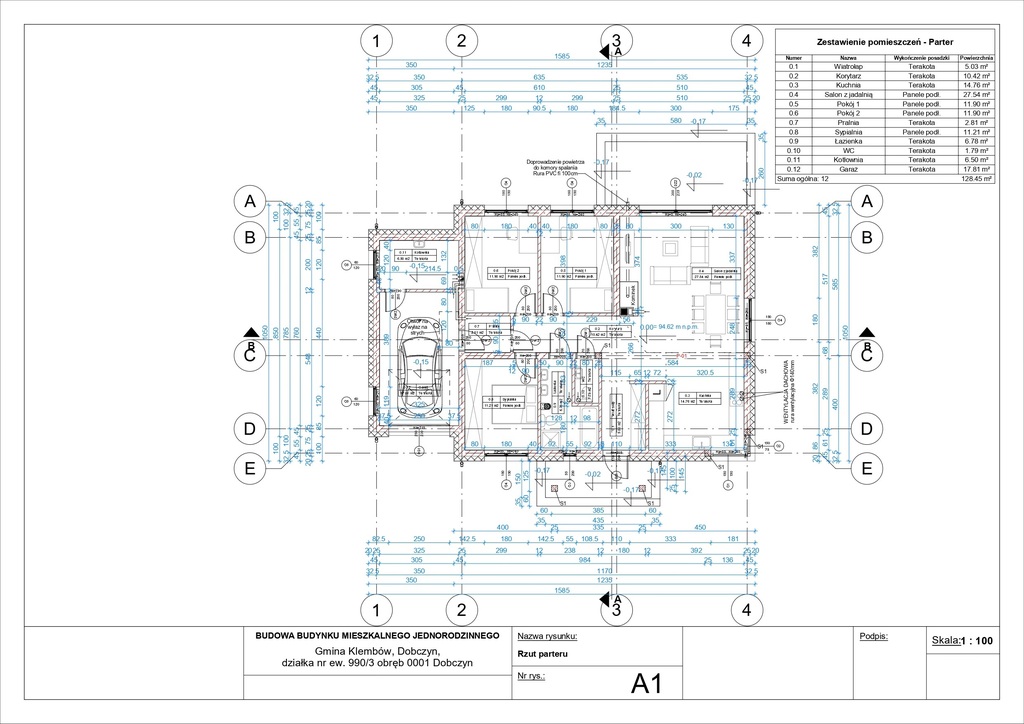 128.45 m2, z garażem w bryle budynku, usytuowanego na przestronnej działce o powierzchni