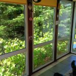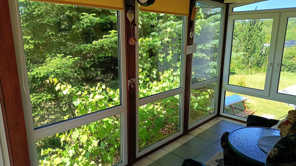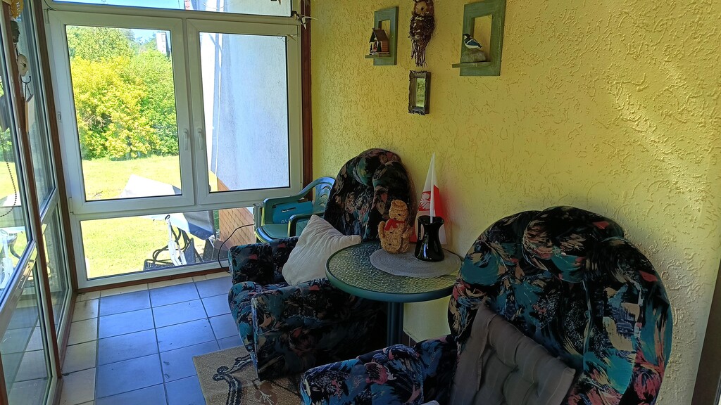 - garaż, który pełni obecnie funkcję gabinetu ( w miejscu drzwi garażowych wstawione są potrójne w pełni przeszklone drzwi balkonowe z roletami zewnętrznymi);