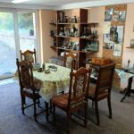 - salon z kominkiem i wyjściem z jednej strony na balkon oraz drugim wyjściem na ogród poprzez oszklony taras (oranżeria);