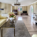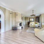 - salon z kominkiem z wyjściem na taras i ogród (43,6 m2)