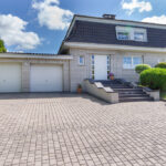 Podjazd do garażu i taras narożny (dwustronny) wyłożony kostką brukową.