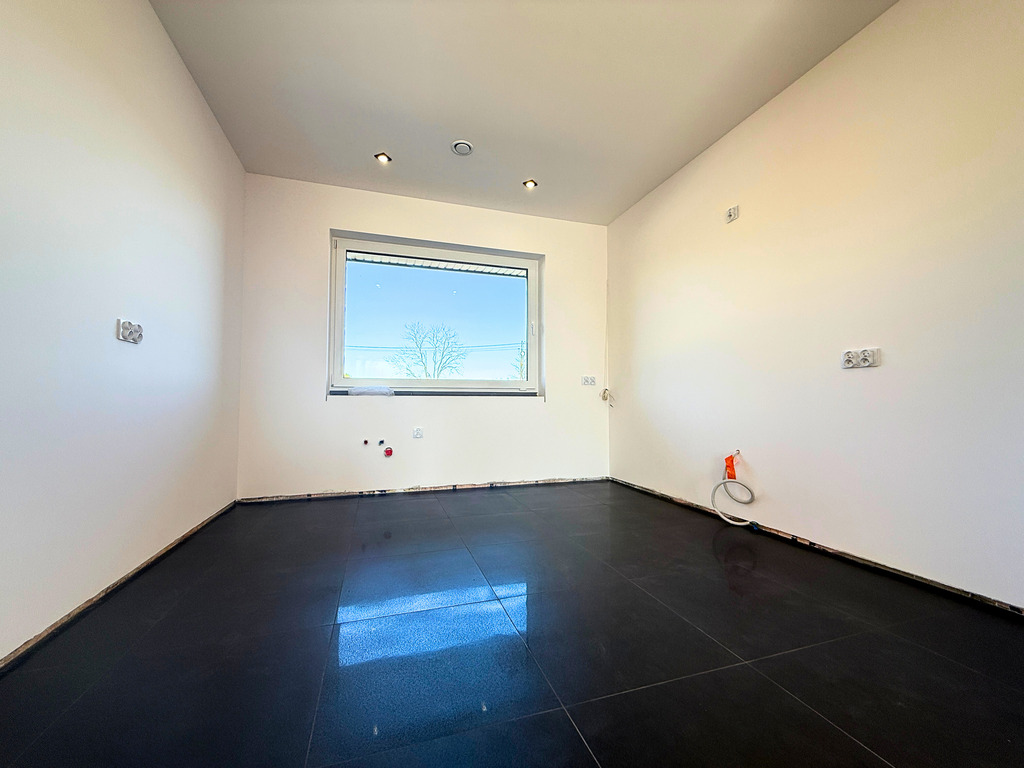 trzyszybowe okna Salamander z roletami elektrycznymi, dachówka cementowa. Wnętrze czeka na Twoje wykończenie.