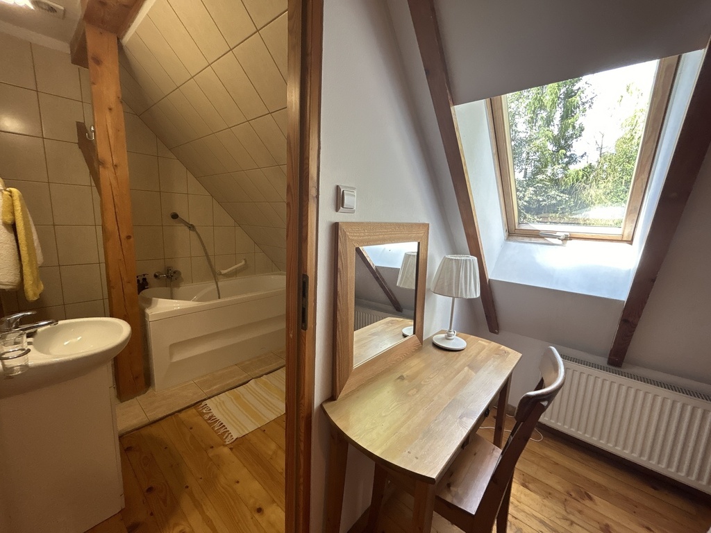 - 9 pokoi o różnym układzie każdy z łazienkami, obecnie miejsc noclegowych 18 ale może być 30, dzisiejsze zagospodarowanie przestrzeni ma dawać wolność i wyciszenie a przyjmowanie gości dorosłych pozwoliło na ograniczenie ilości łóżek w pokojach.