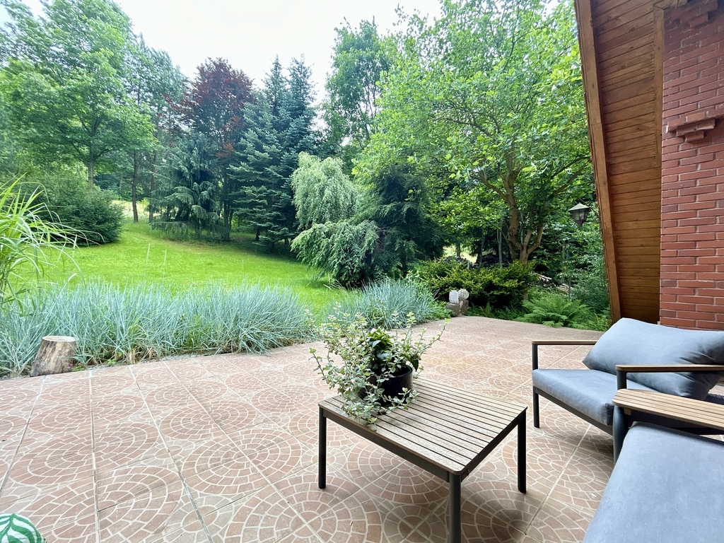 Cały grunt zagospodarowany, przy budynkach część parkingowa, alejki wypoczynkowe, miejsce na grilla, ścieżki spacerowe w lesie.