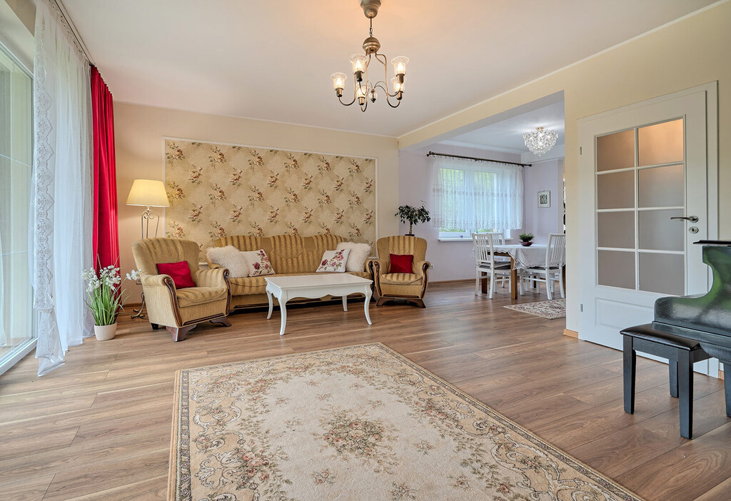 II KONDYGNACJA- salon (pow. ok. 27 m2) z wyjściem na taras i ogród wraz z jadalnią (pow. ok. 10 m2) oraz aneksem kuchennym (pow. ok. 8 m2),