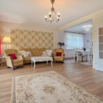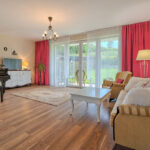 - salon (pow. ok. 27 m2) z wyjściem na taras i ogród wraz z jadalnią (pow. ok. 10 m2) oraz aneksem kuchennym (pow. ok. 8 m2),