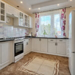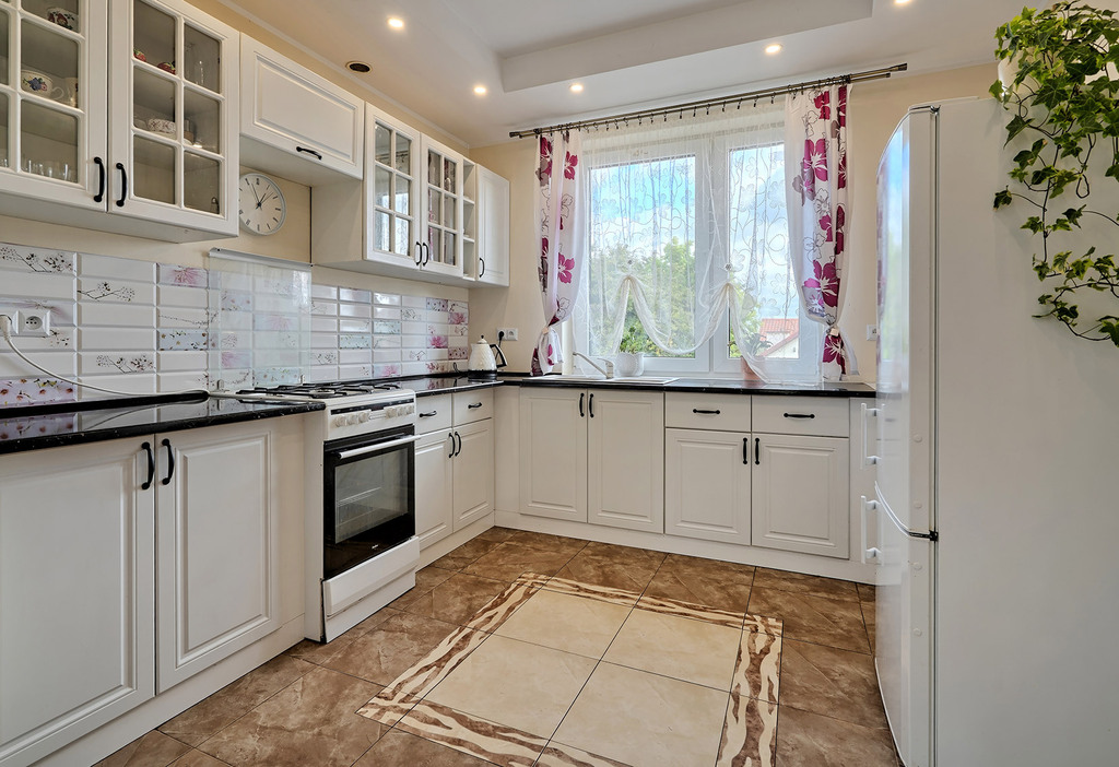 Wyposażona jest w zabudowę meblową z pięknymi biały frontami oraz wszelki potrzebny sprzęt AGD: zmywarkę, piekarnik, lodówkę z zamrażarką.