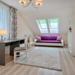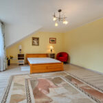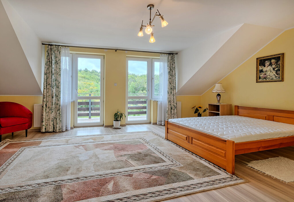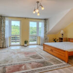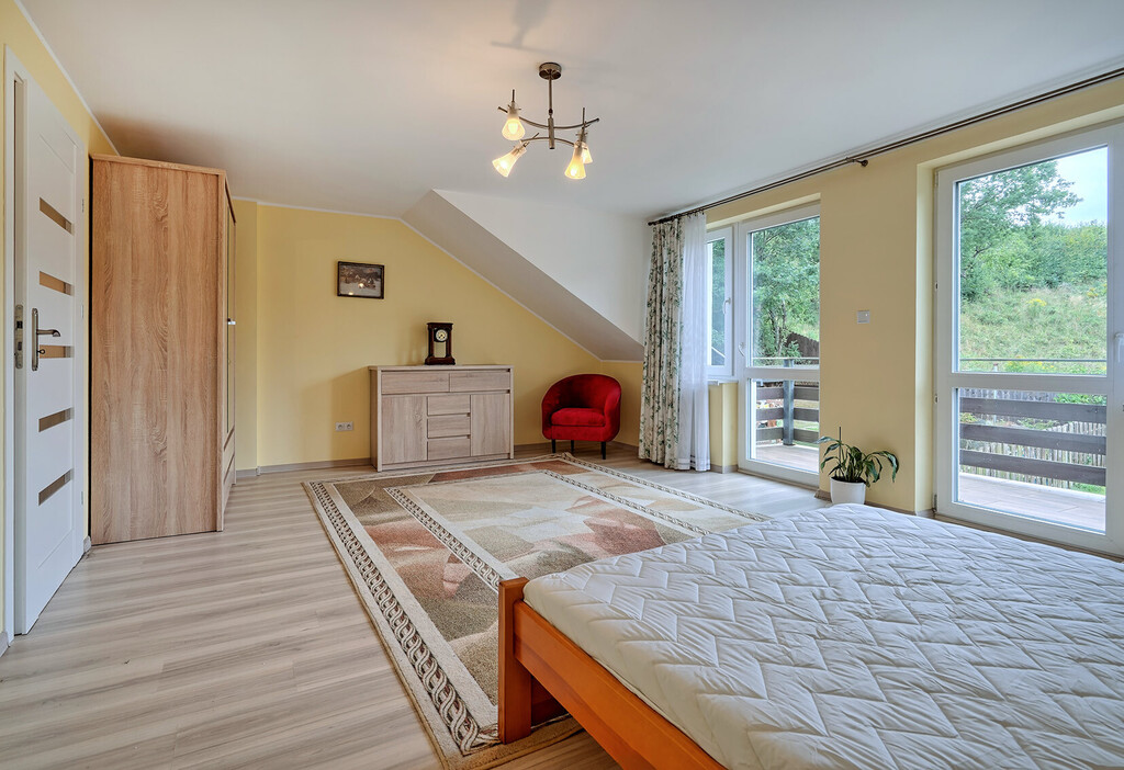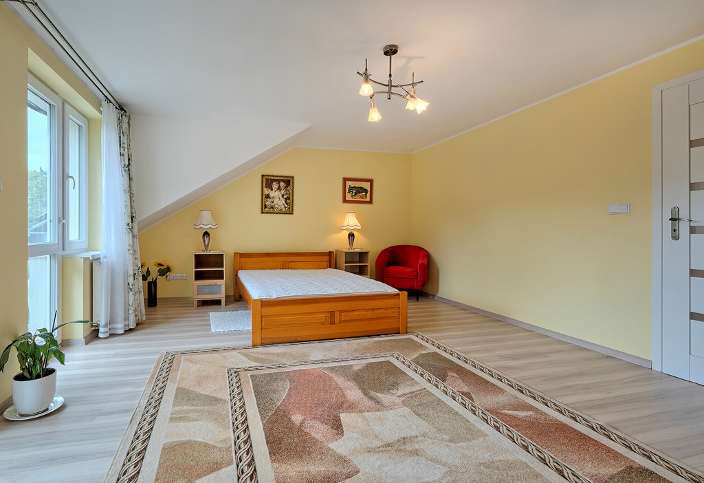 - sypialnia z łożem małżeńskim (pow. ok. 25 m2) z wyjściem na balkon z widokiem na ogród,