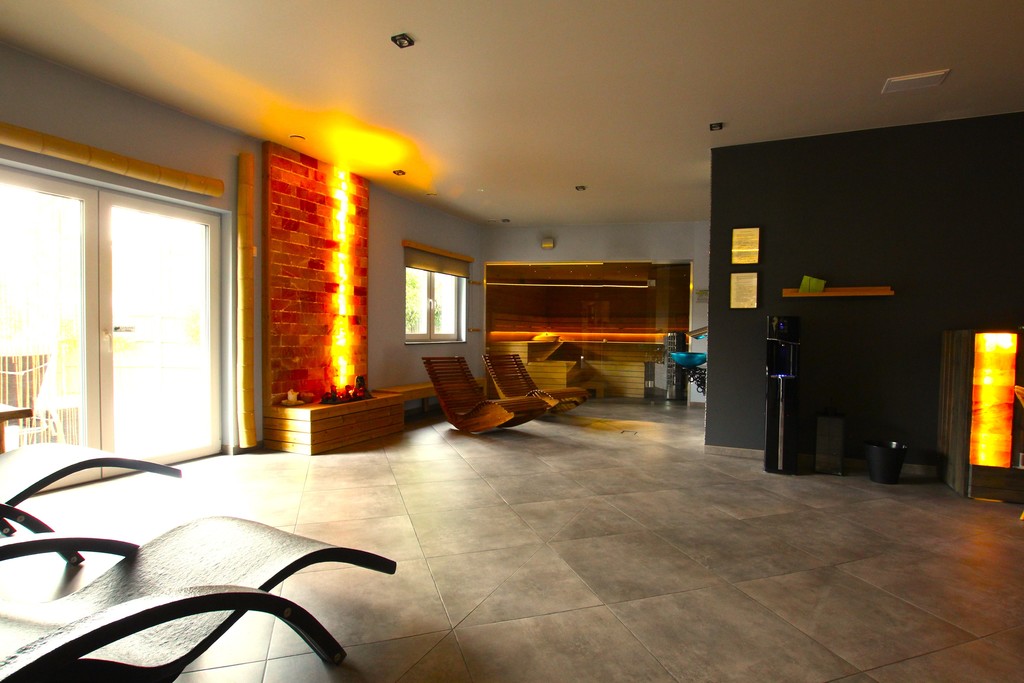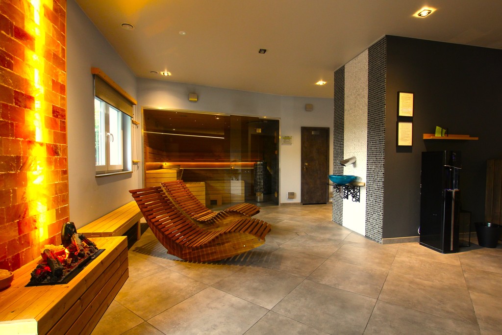 strefa relaksu, sauna fińską, łaźnia parowa, podwójny prysznic, urządzenie do produkcji lodu, tężnia solankowa, kominek elektryczny, leżaki.