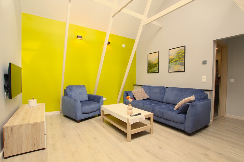 - Pokój wypoczynkowy z sofą rozkładaną, fotelem i TV