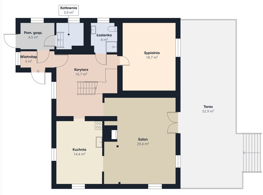 PARTER (Strefa Dzienna): przestronny salon z klimatycznym kominkiem i bezpośrednim wyjściem na przestronny taras, funkcjonalna kuchnia, pokój, łazienka. Plus praktyczne zaplecze: wiatrołap, kotłownia i pomieszczenie gospodarcze.