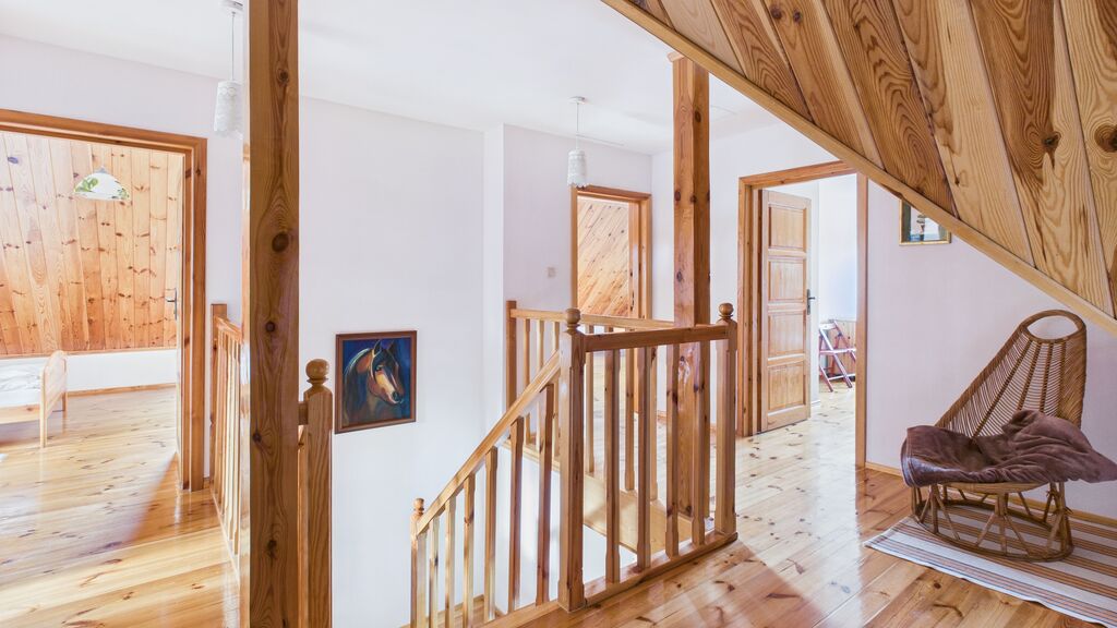 Solidny, drewniany dom szkieletowy z 2013 roku, o powierzchni użytkowej 168 m² (całkowita ok. 198 m²) ma bardzo praktyczny układ.