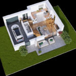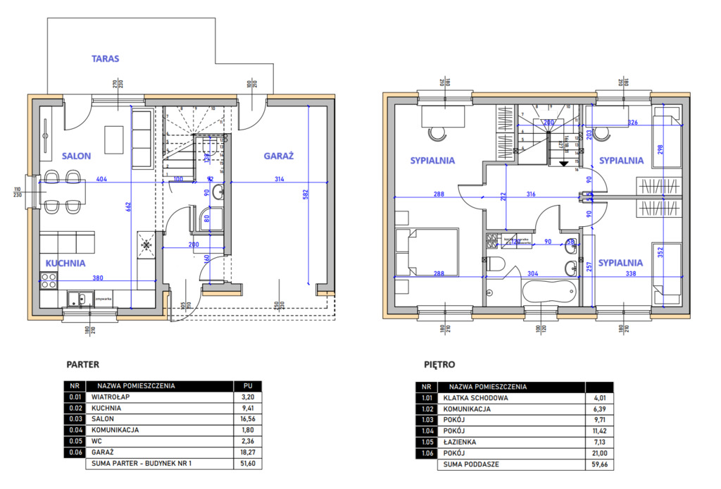 Parter: garaż, salon z kuchnią, wc, korytarz i klatka schodowa.