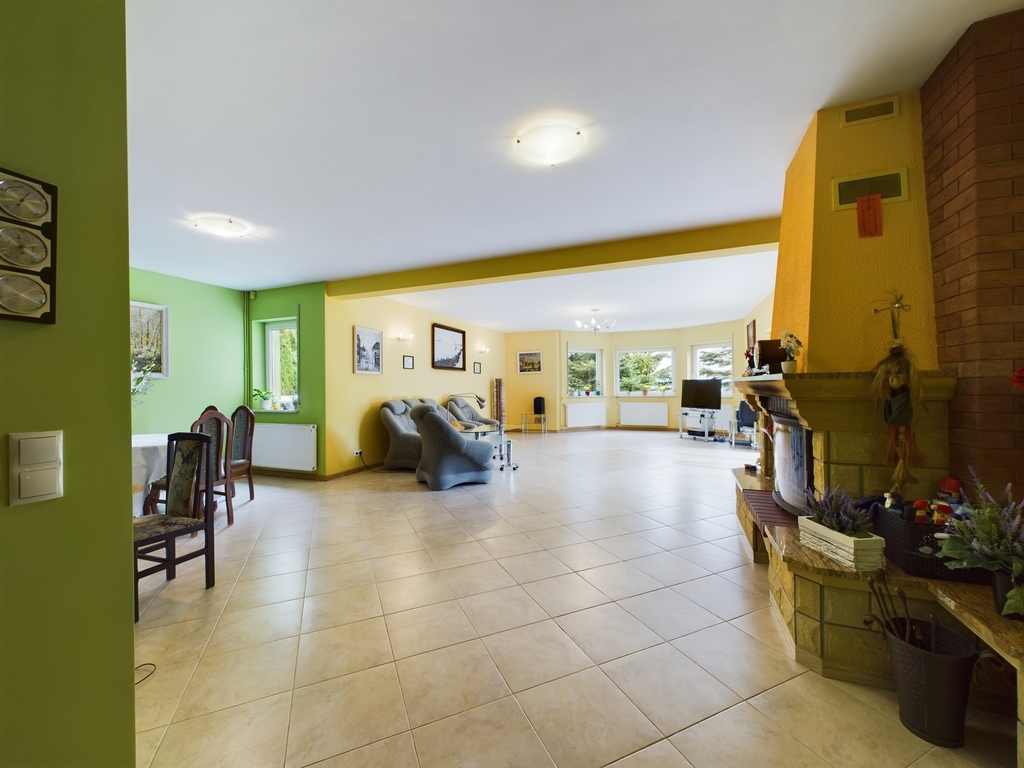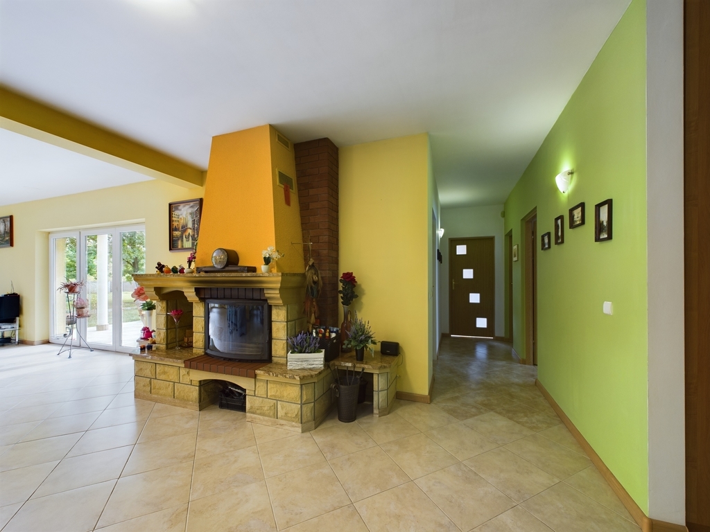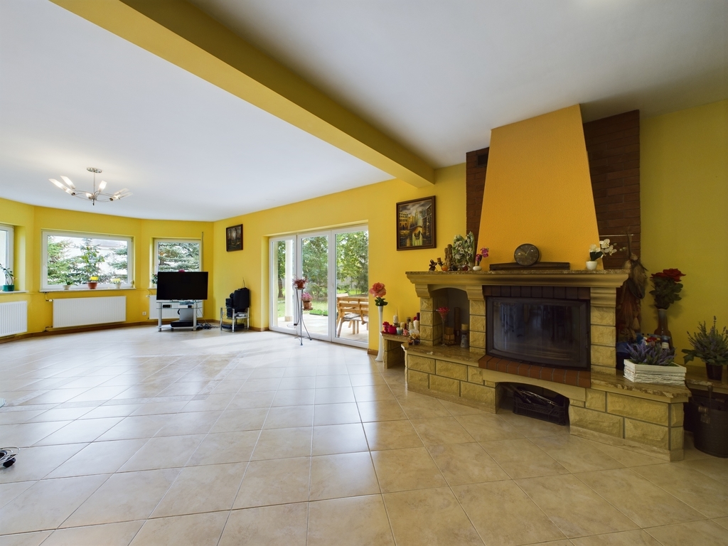 • Jasny salon z otwartą kuchnią i kominkiem z płaszczem wodnym – idealny na spotkania z rodziną i przyjaciółmi