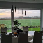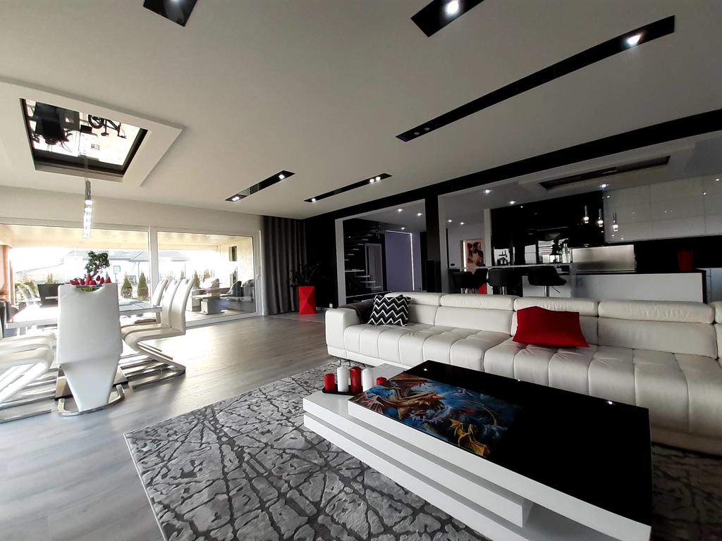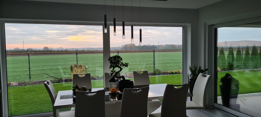 Okna sięgają podłogi i mają 4,5 m szerokości. Takiej samej szerokości jest zamontowane okno HS dzielone na pół przez które jest wyjście na 36 metrowy zadaszony taras.