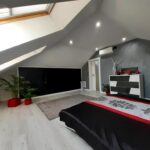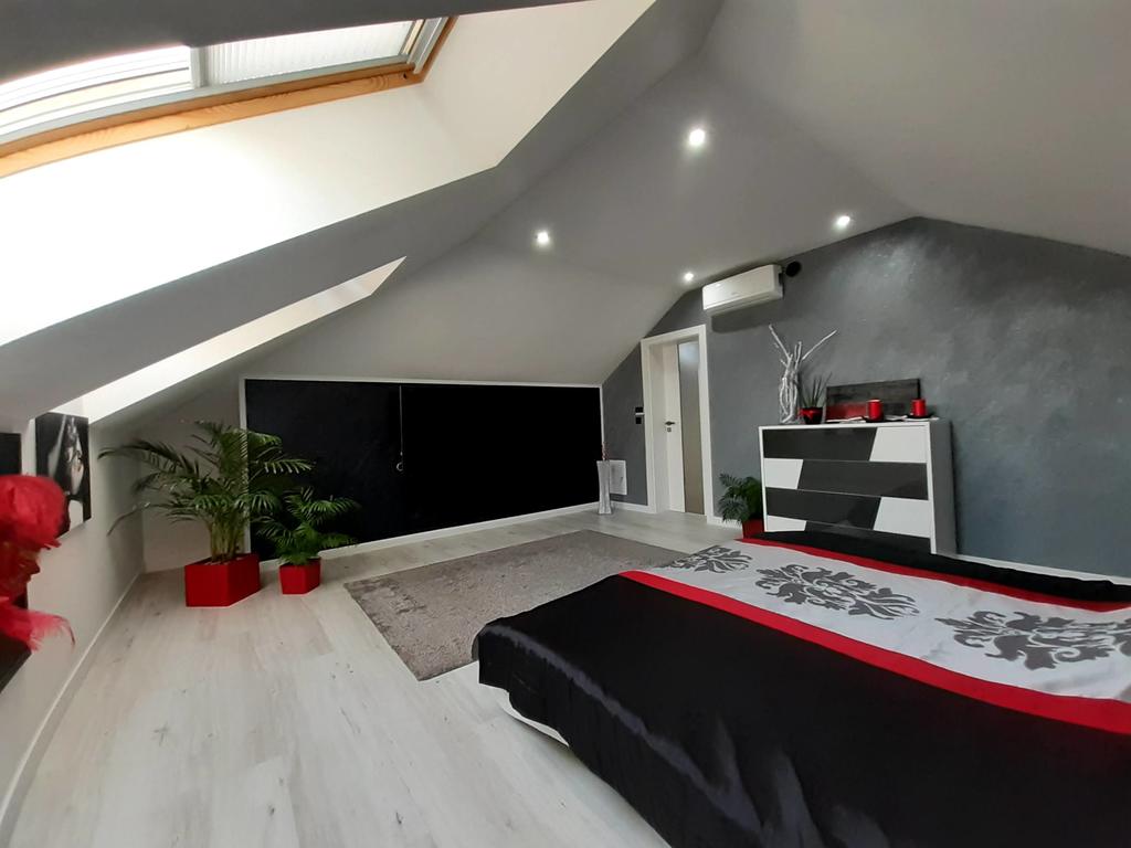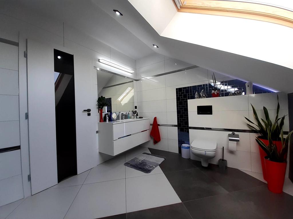 Poddasze składa się z dwóch sypialni, nowoczesnej łazienki z prysznicem, dużej garderoby z wyspą oraz pomieszczenia gospodarczego.